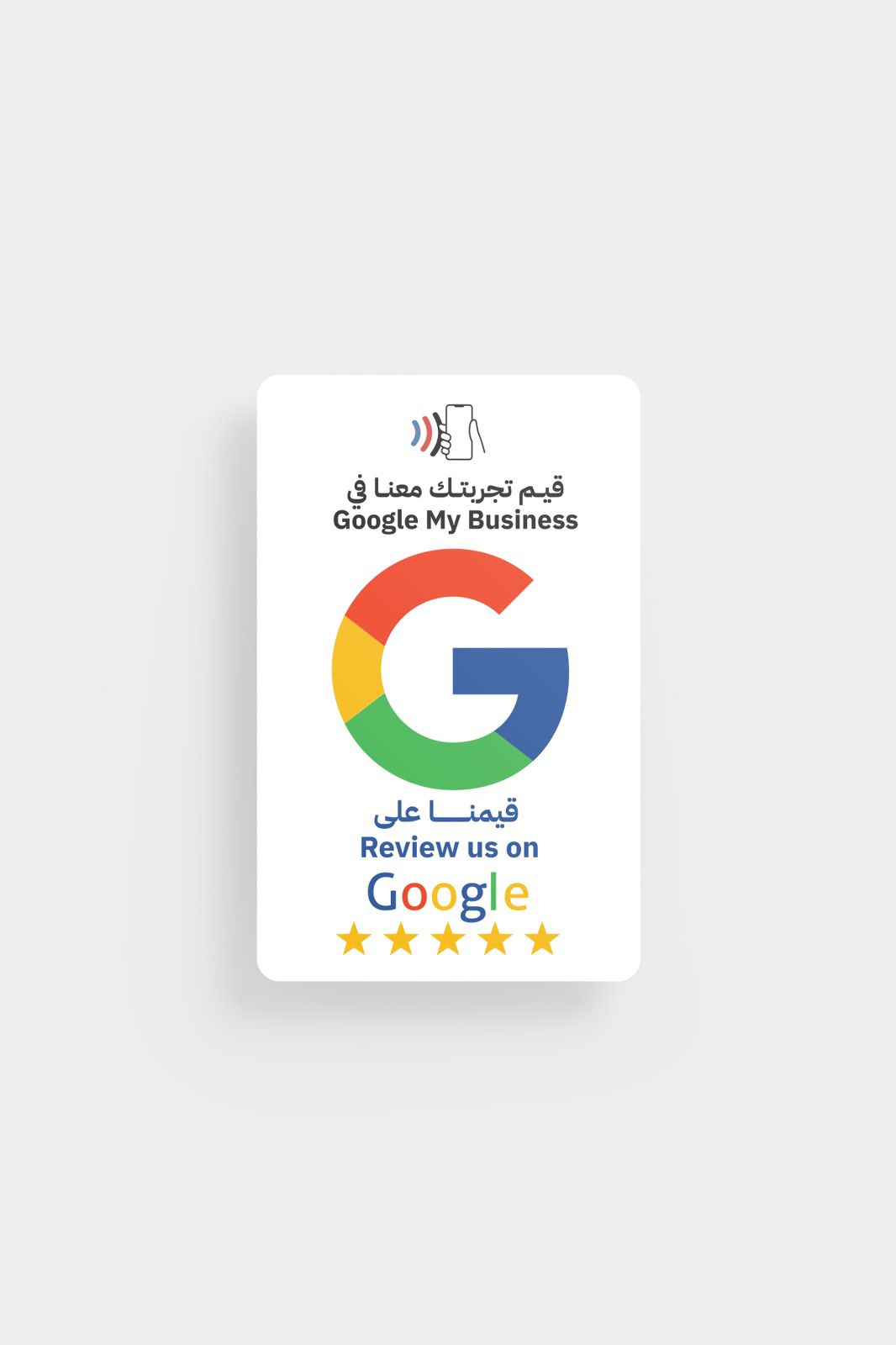 البطاقة تحتوي على شريحة NFC تعمل بتقنية اللمس. عندما يقترب العميل هاتفه من البطاقة (5 سم)، يفتح تلقائياً رابط صفحة التقييم على Google. لا يحتاج لتحميل أي تطبيق أو إجراء معقد.